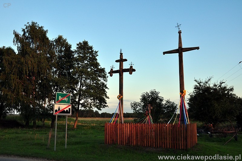 Miejscowość Brody obfituje w liczne jak na jej wielkość małe obiekty sakralne. Stoją tu dwie murowane kapliczki, oraz w sumie (jeżeli dobrze pamiętam) 8 krzyży. Na początku wsi ogrodzone płotkiem znajdują się trzy z nich. Widać postawione tu w różnych czasach. Najstarszy z nich prawdopodobnie z końca XIX wieku, ma dwie poziome poprzeczki, więc był krzyżem cholerycznym, ustawionym aby chronił przed panującą wówczas zarazą. Drugi drewniany prawdopodobnie stanął w podziękowaniu za uniknięcie przez wieś choroby. Granitowy krzyż pochodzi z 1915 roku o czym informuje nas napis widniejący na nim. Poza datą napisany jest tekst "Od nagłej i niespodziewanej śmierci zachowaj nas Panie Jezu. Fundator wieś Brodzińska"