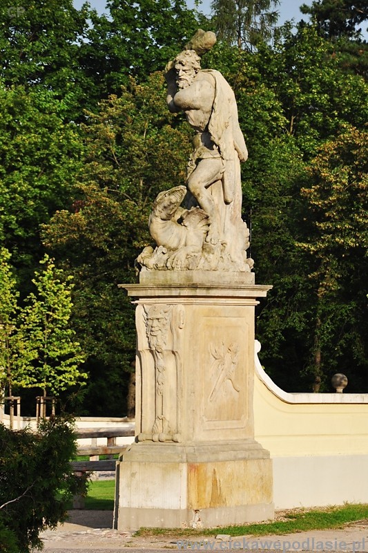 Dziedziniec ten [wstępny] opiera się o oficyny pałacowe i o dziedziniec przed pałacem brukowany, którego wjazd przyozdobiony jest znacznej wielkości z kamienia robionymi dwoma Herkulesami.