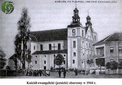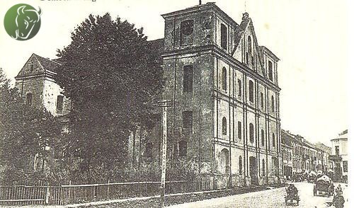 Budowę dużego, murowanego kościoła rozpoczęli jezuici w 1621 roku, na miejscu poprzedniego, drewnianego kościółka, zniszczonego przez pożar. Budowa trwała bardzo długo i zakończyła się dopiero w 1732 roku. Świątynia składała się z trzech obszernych naw wspartych na filarach. Uroku dodawały dwie wysokie wieże, a na jednej z nich był zegar. W 1853 roku władze carskie oddały kościół ewangelikom przyznając im 3 tysiące rubli na remont. W roku 1880 zarządzono zdjęcie wież - nie do końca wiadomo z jakiego powodu: czy ze względu na to, że były bardzo zniszczone, czy też dlatego, że górowały ponad wieżami nowo wybudowanej cerkwi przy ul. Sienkiewicza. W 1944 roku świątynia została zburzona przez wycofujących się Niemców.